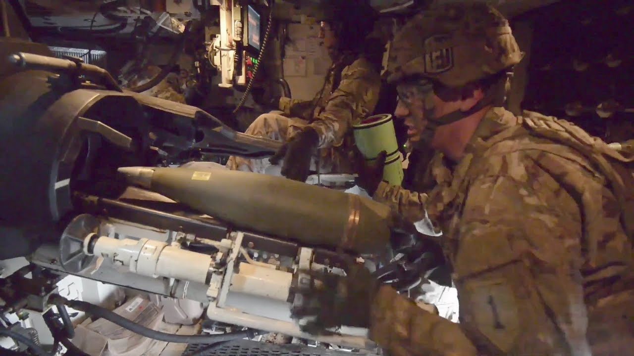 U.S. soldiers with Battery A, 1st Battalion, 7th Field Artillery Regiment, 2nd Armored Brigade Combat Team, 1st Infantry Division, fire M109A6 Paladin howitzers during a training exercise at the 7th Army Training Command’s Grafenwoehr Training Area.