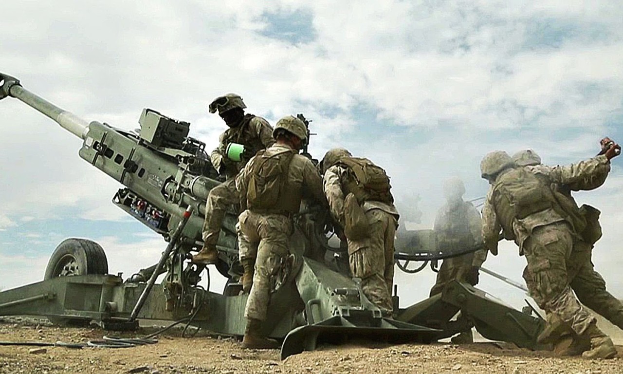 U.S. Marine Corps CH-53E Super Stallion helicopters sling load M777 howitzers for a fire mission training at Fire Base Burt, Chocolate Mountain Aerial Gunnery Range, California.