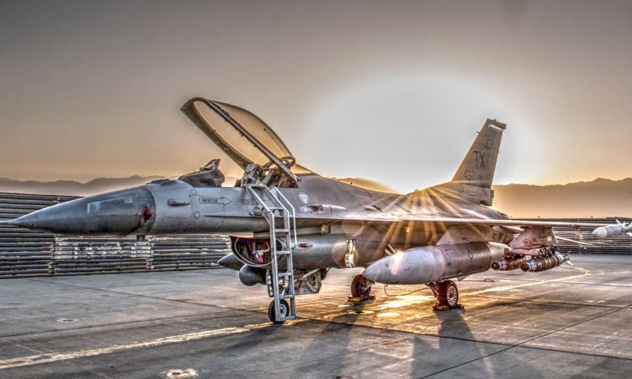 Video of a F-16 sitting in front of a sunset plus footages of the aircraft taxiing around runway and the take-offs.