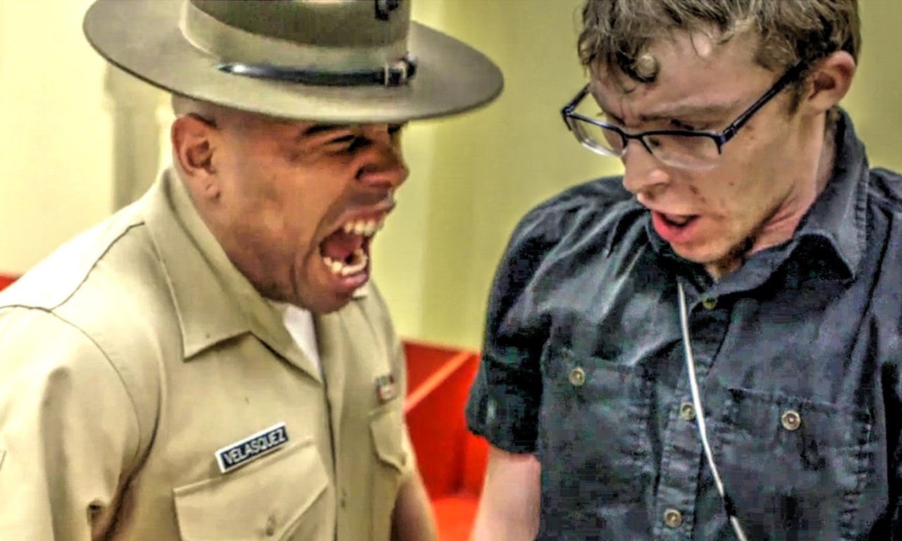 U.S. Marine Corps recruits arriving at Marine Corps Recruit Depot (MCRD) San Diego, are taken into the contraband room and the barber during their first night of recruit training. Recruits were checked contraband items, received their first military haircut, and began recruit training.