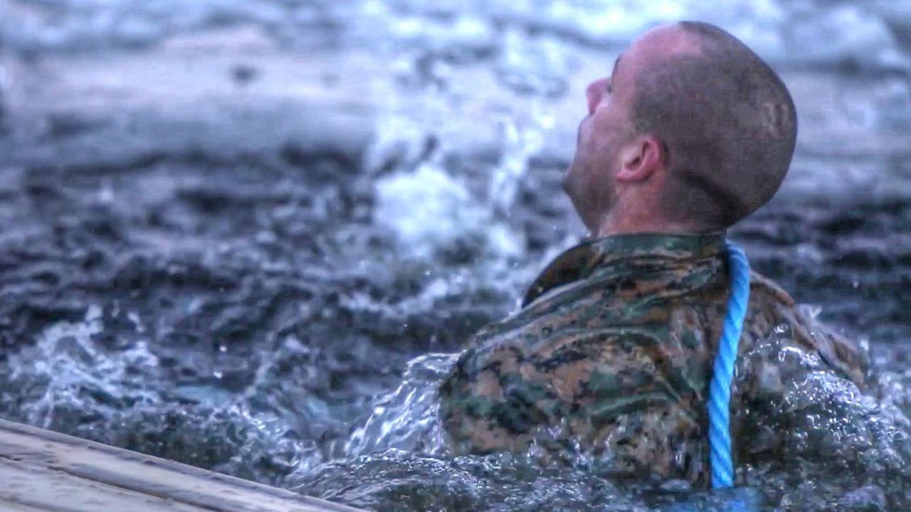 U.S. Marines Black Sea Rotational Force jump into ice water during training with the Norwegian army Cold Weather and Mountain Training Instructors in Blåtind, Norway.