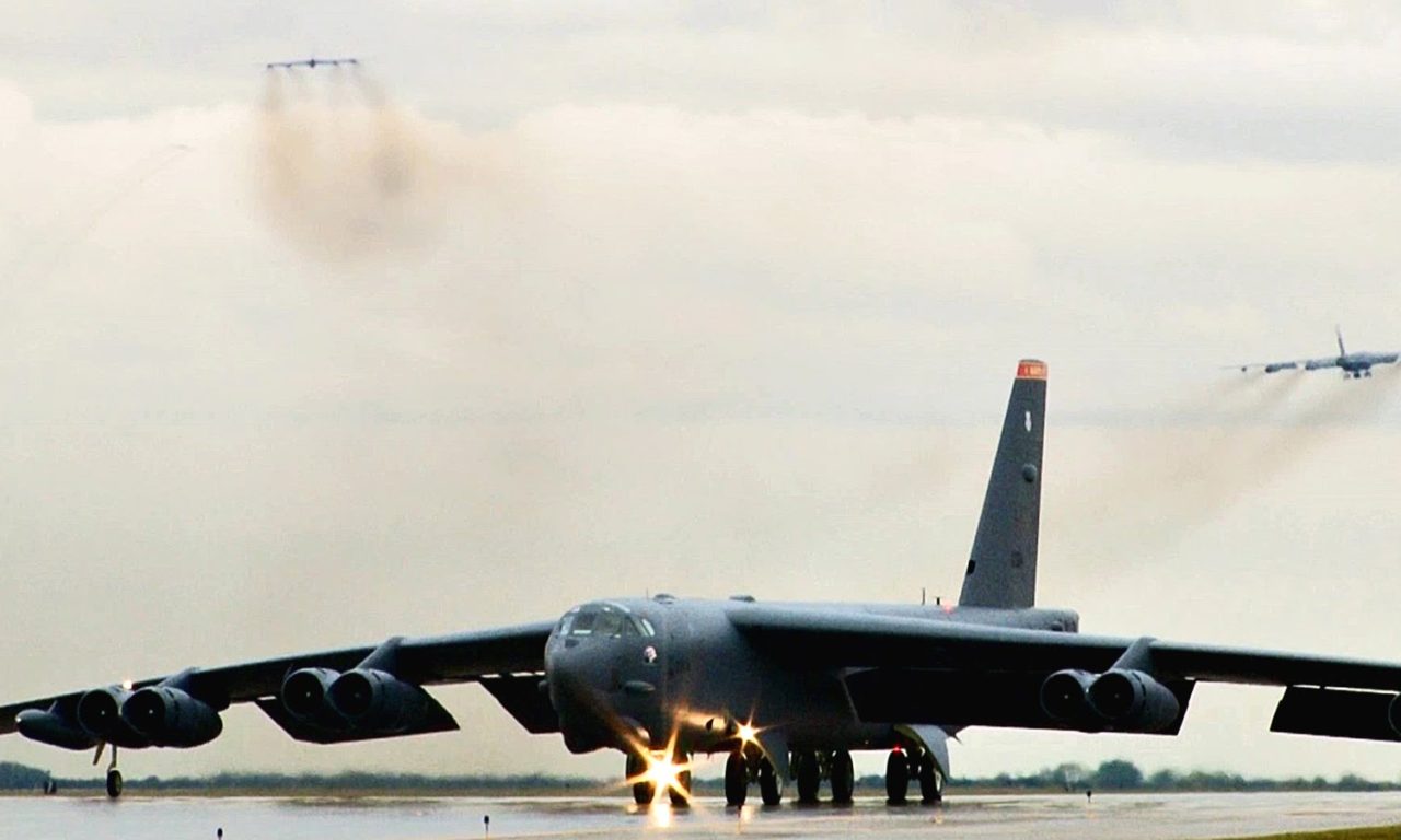 Twelve 5th Bomb Wing B-52 aircraft take off during an exercise at Minot Air Force Base, North Dakota.