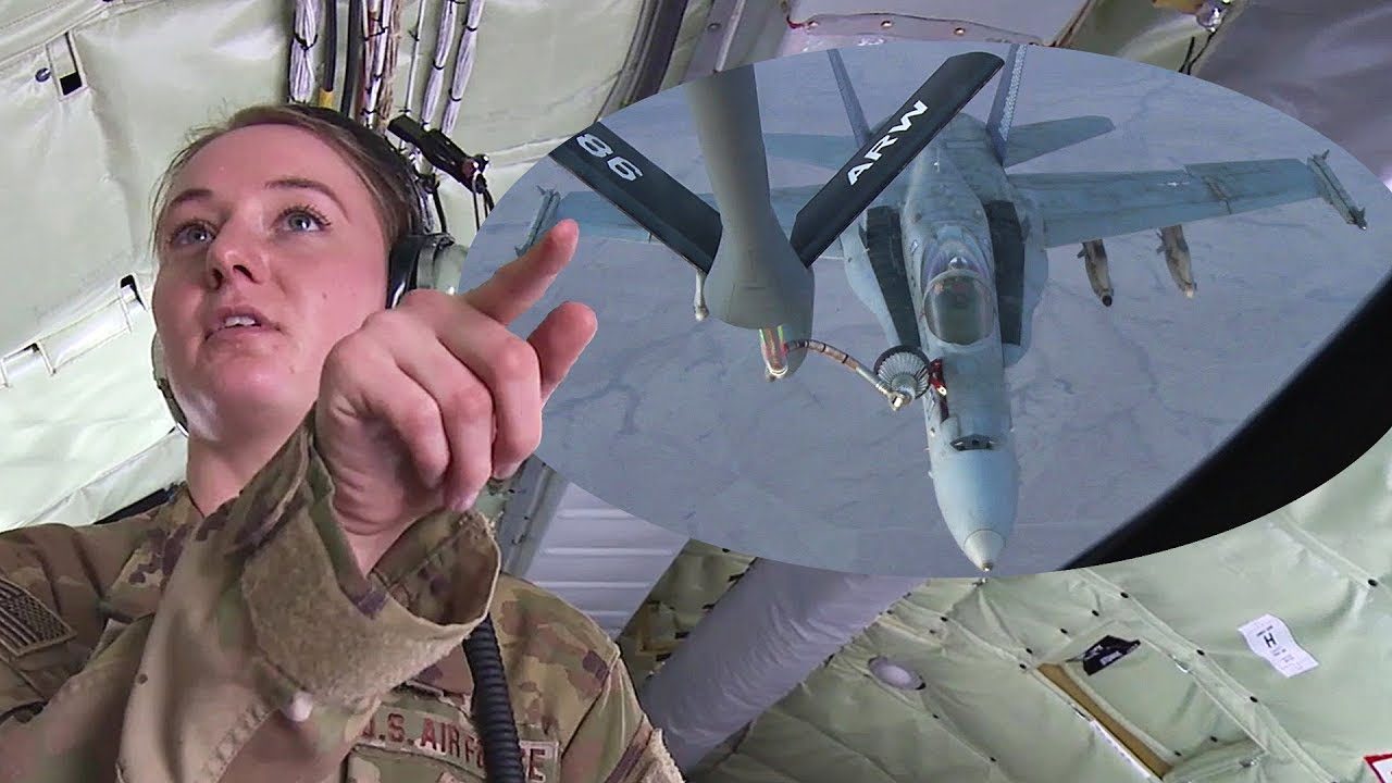Watch US Navy F/A-18C fighters receive fuel in flight from a US Air Force KC-135 aerial refueling aircraft over Asia. The tanker, from the 186th Air Refueling Wing, Mississippi Air National Guard, is fitted with a drogue attached to the boom for specialized receiver on Navy aircraft.