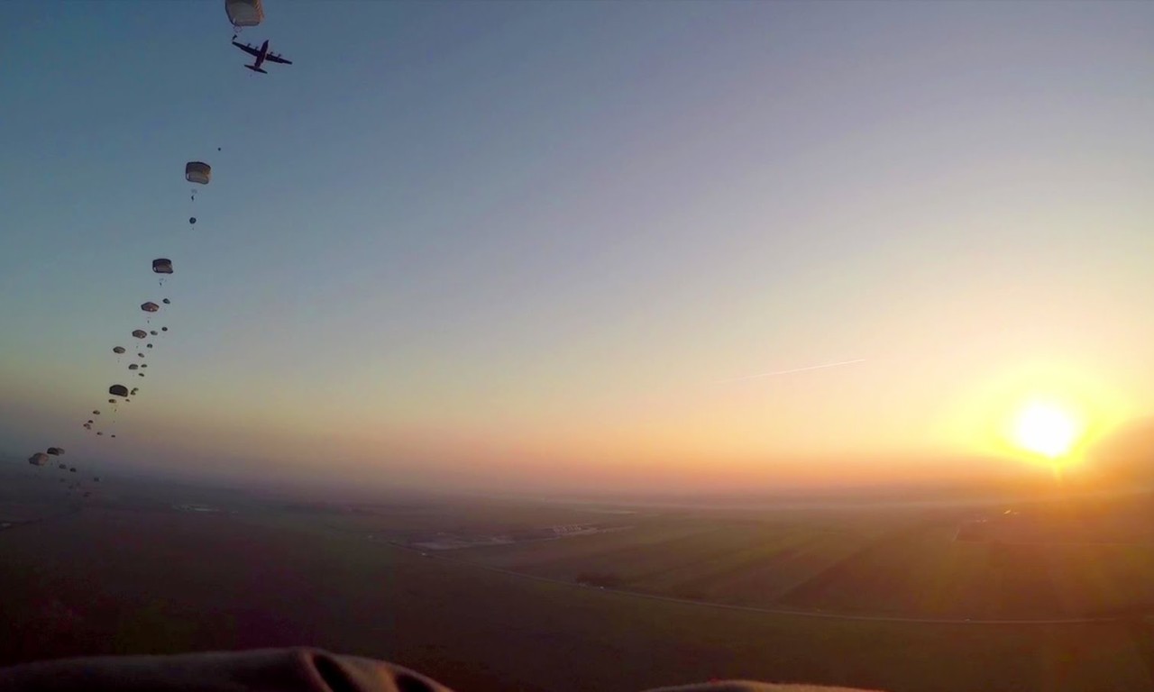 Body-mounted camera view from a U.S. Army jumpmaster as he conducts an airborne operation from a C-130 Hercules aircraft.