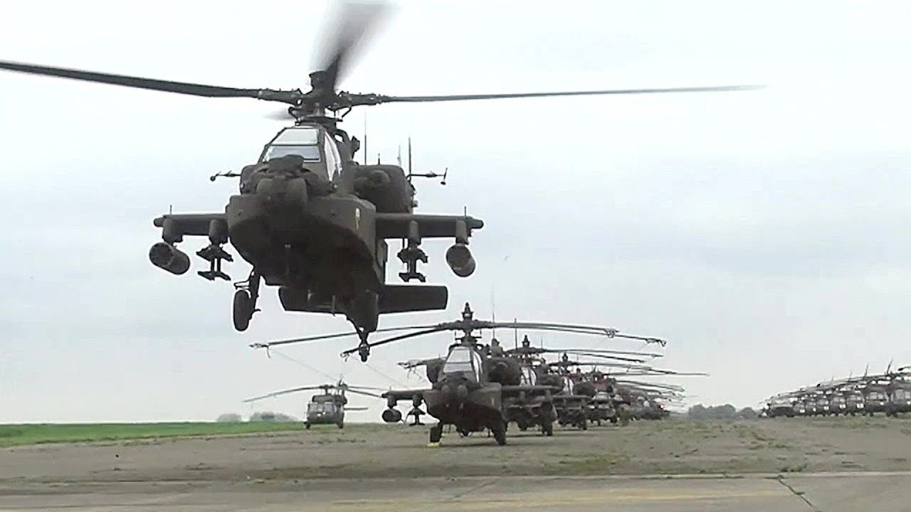AH-64 Apache and UH-60 Black Hawk helicopters of the 1st Air Cavalry Brigade take off from Chièvres Air Base, Belgium in support of Operation Atlantic Resolve. Members of the 1st Air Cavalry Brigade arrived with 77 helicopters to the port of Zeebrugge, Belgium, in October and then came to the air base before deploying to Germany, Poland, Latvia and Romania.