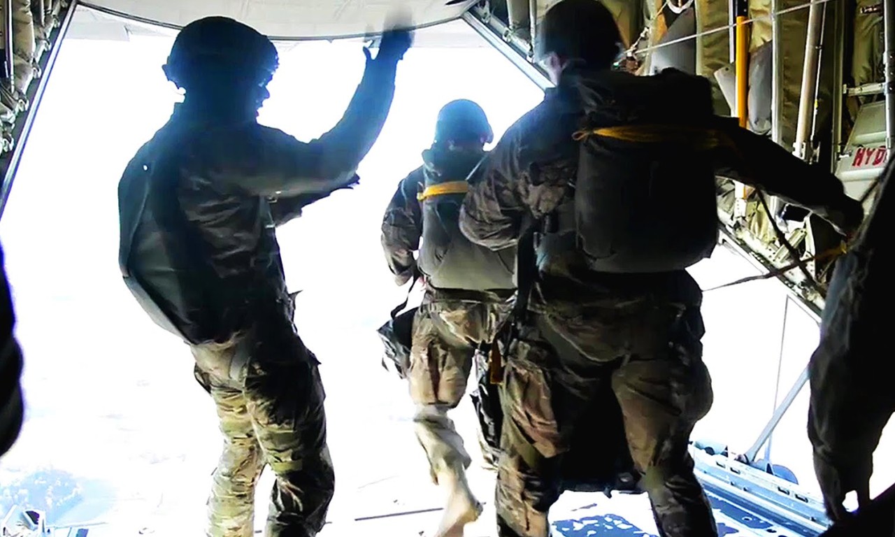 Special operations Soldiers assigned to Special Operations Command Europe take part in airborne qualification jump flying out of Stuttgart Army Airfield to jump into the Malmsheim airfield near Malmsheim, Germany.