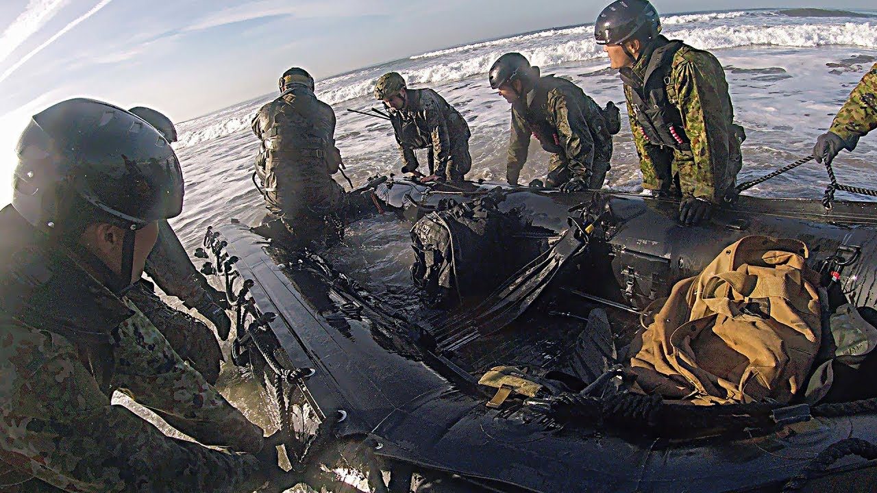 U.S. Marines with 1st Reconnaissance Battalion and Japanese Soldiers with the Western Army Infantry Regiment, Japan Ground Self Defense Force, conduct helocast exercises and amphibious reconnaissance practical application drills with CRRC Zodiac boats as part of Exercise Iron Fist 2018.