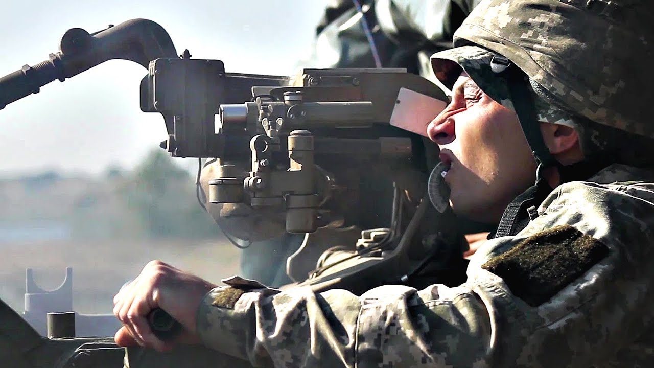 Ukrainian airborne troops engaging ground level targets with a ZU-23 anti-aircraft weapon during training at the Yavoriv Combat Training Center, Western Ukraine.