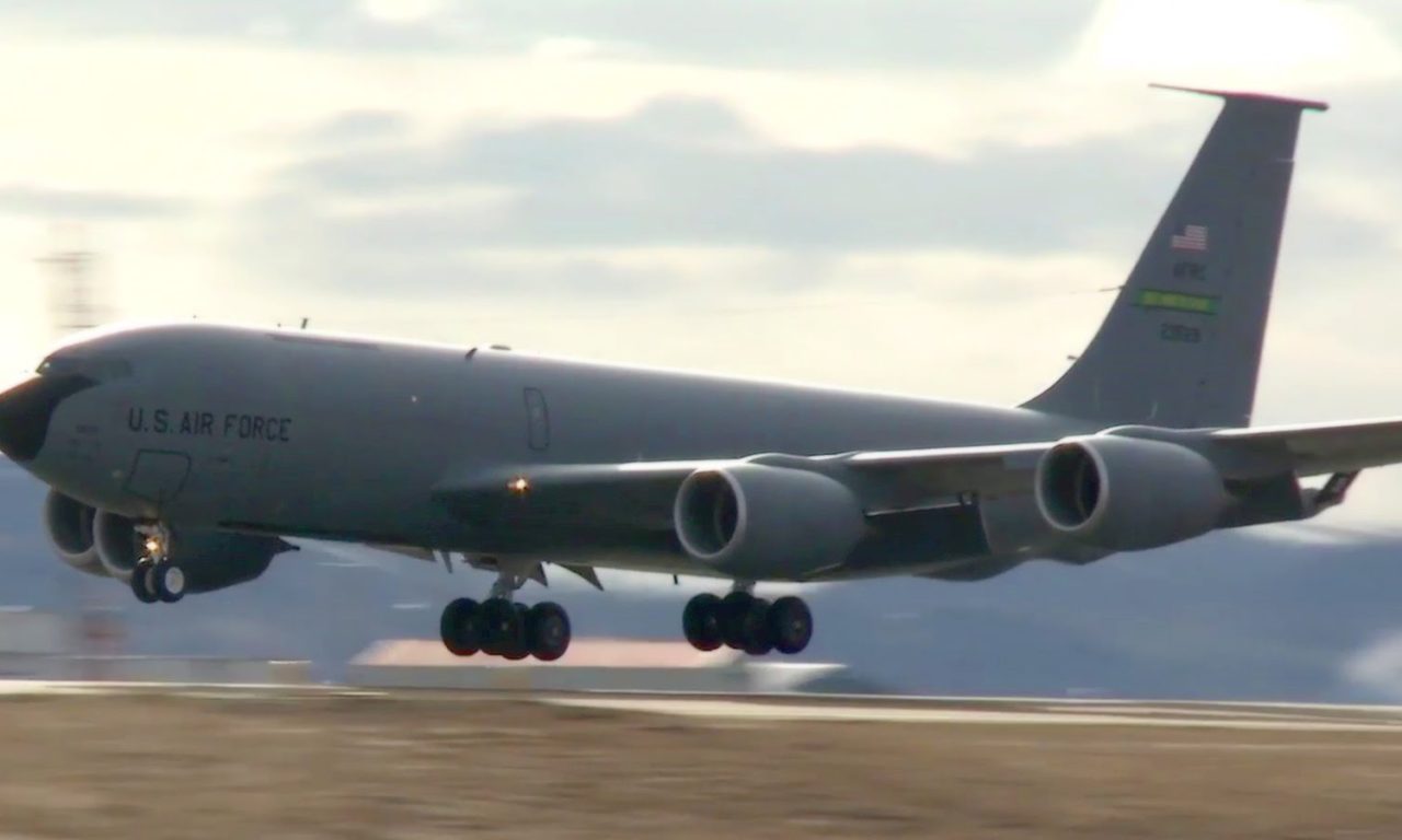 Video of U.S. Air Force F-15C fighter and U.S. Air Force KC-135 Stratotanker takeoff and landings at Keflavik International Airport supporting Icelandic Air Surveillance operations. Shots include F-15C flying overhead and through clouds and aircraft taxiing down toward hardened aircraft shelters.