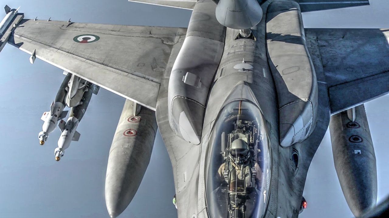 USAF Airmen from the 340th Expeditionary Air Refueling Squadron deliver fuel from a KC-135 Stratotanker to United Arab Emirates F-16 Block 60 Desert Falcons.