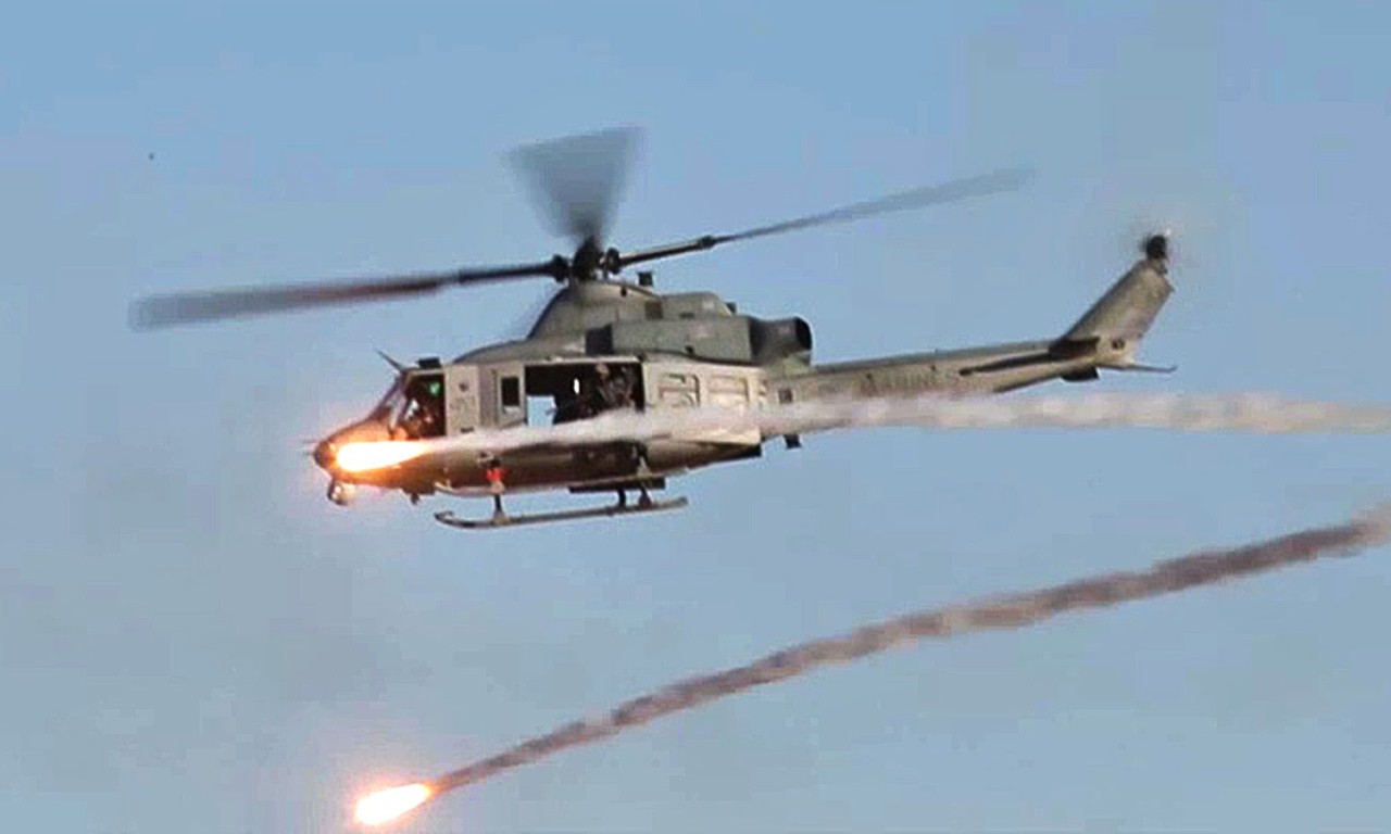 U.S. Marines UH-1Y Huey and AH-1W Super Cobra helicopters participate in an offensive air support exercise near Yuma, Arizona.