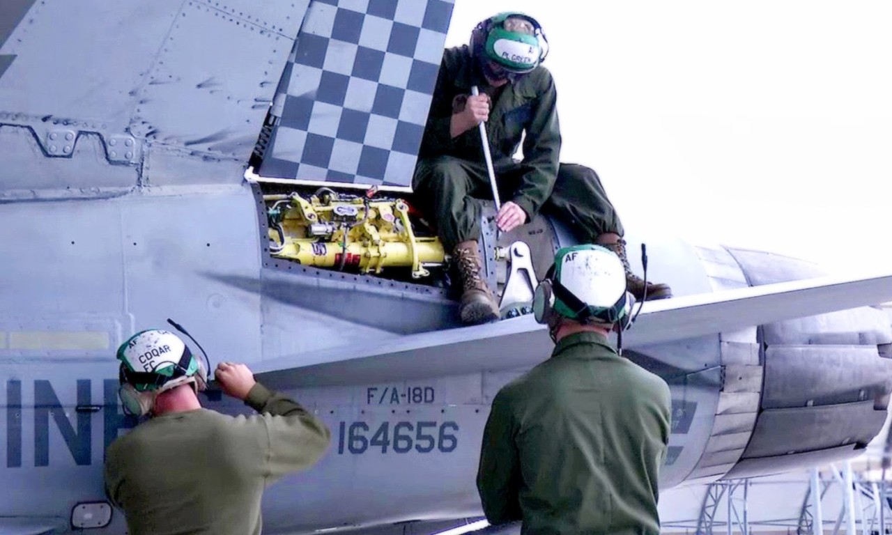 Marines at Marine Corps Air Station Iwakuni, Japan working on an F/A-18D Hornet.